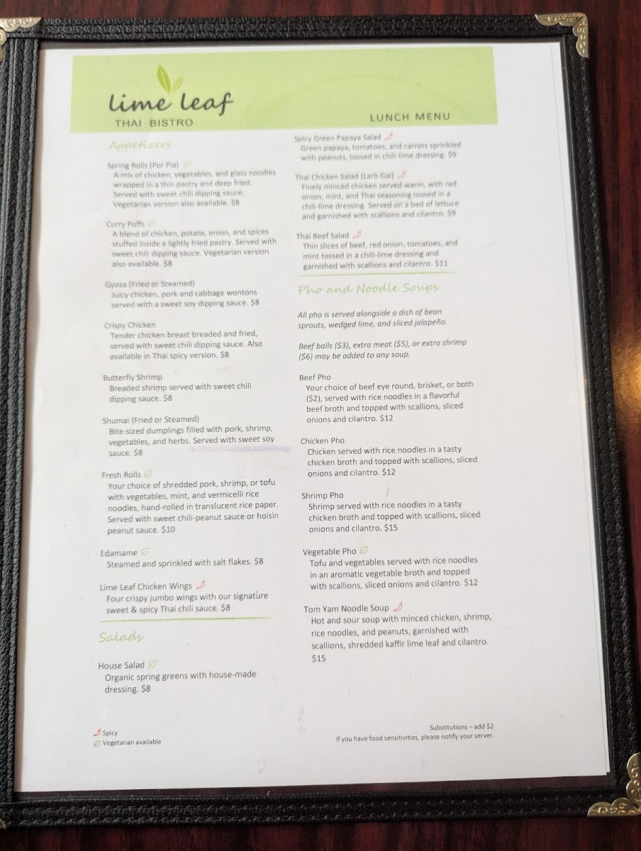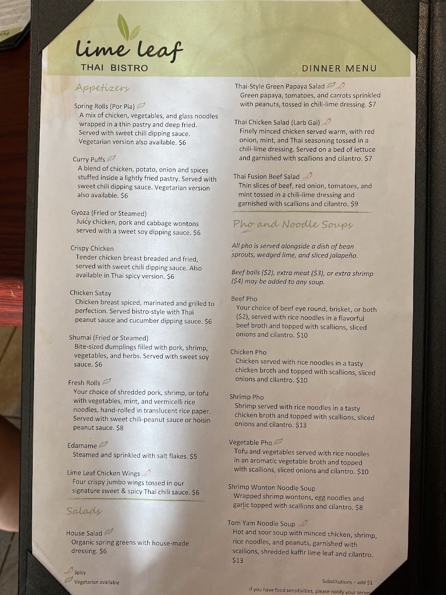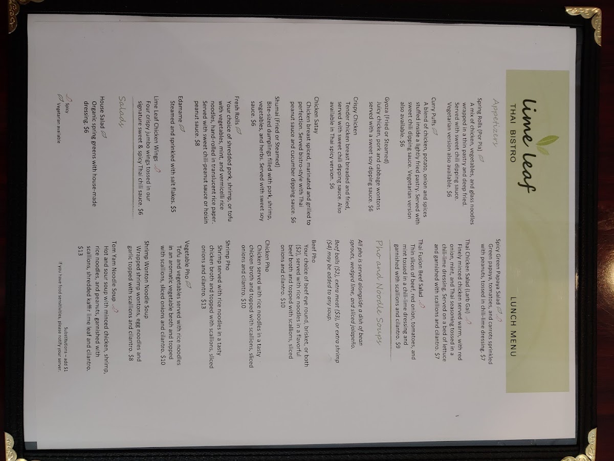 Lime Leaf Thai Bistro offers a flavorful and diverse menu that highlights authentic Thai cuisine with a variety of options to suit every palate. To start, guests can enjoy appetizers like the crispy Spring Rolls and the savory Curry Puffs, each offering a delightful blend of textures and flavors. For those seeking something more indulgent, the Gyoza, Crispy Chicken, and Butterfly Shrimp are excellent choices. The salad section features fresh and vibrant options such as the refreshing House Salad and the zesty Spicy Green Papaya Salad, along with the popular Thai Chicken Salad (Larb Gai) and the more robust Thai Beef Salad. For a comforting and filling dish, the Pho & Noodle Soups offer comforting bowls like the Beef Pho, Chicken Pho, and Shrimp Pho, along with a hearty Vegetable Pho for vegetarians. The menu also includes the aromatic and flavorful Tom Yam Noodle Soup, perfect for anyone craving a tangy and spicy experience. The wide range of dishes available makes Lime Leaf Thai Bistro an excellent choice for those looking to explore the rich and vibrant flavors of Thai cuisine in a cozy setting.