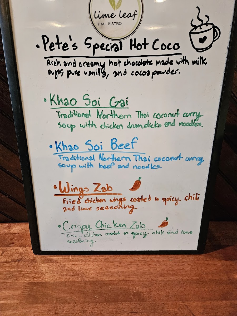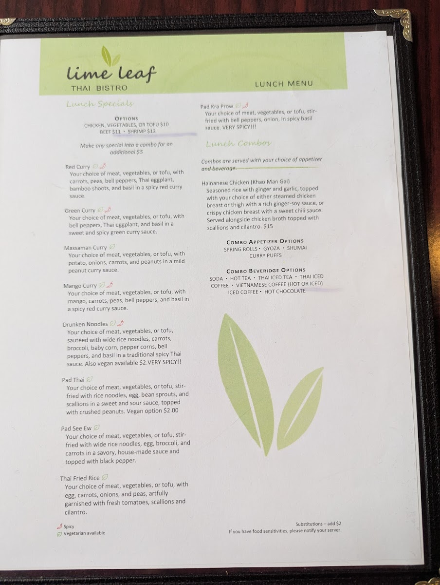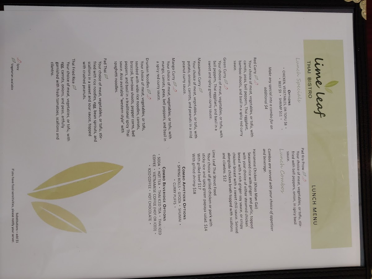 Lime Leaf Thai Bistro offers a flavorful and diverse menu that highlights authentic Thai cuisine with a variety of options to suit every palate. To start, guests can enjoy appetizers like the crispy Spring Rolls and the savory Curry Puffs, each offering a delightful blend of textures and flavors. For those seeking something more indulgent, the Gyoza, Crispy Chicken, and Butterfly Shrimp are excellent choices. The salad section features fresh and vibrant options such as the refreshing House Salad and the zesty Spicy Green Papaya Salad, along with the popular Thai Chicken Salad (Larb Gai) and the more robust Thai Beef Salad. For a comforting and filling dish, the Pho & Noodle Soups offer comforting bowls like the Beef Pho, Chicken Pho, and Shrimp Pho, along with a hearty Vegetable Pho for vegetarians. The menu also includes the aromatic and flavorful Tom Yam Noodle Soup, perfect for anyone craving a tangy and spicy experience. The wide range of dishes available makes Lime Leaf Thai Bistro an excellent choice for those looking to explore the rich and vibrant flavors of Thai cuisine in a cozy setting.